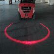 Lampa świeci w kolorze czerwonym , wyznacza teren pracy wózka widłowego lub innej maszyny magazynowej